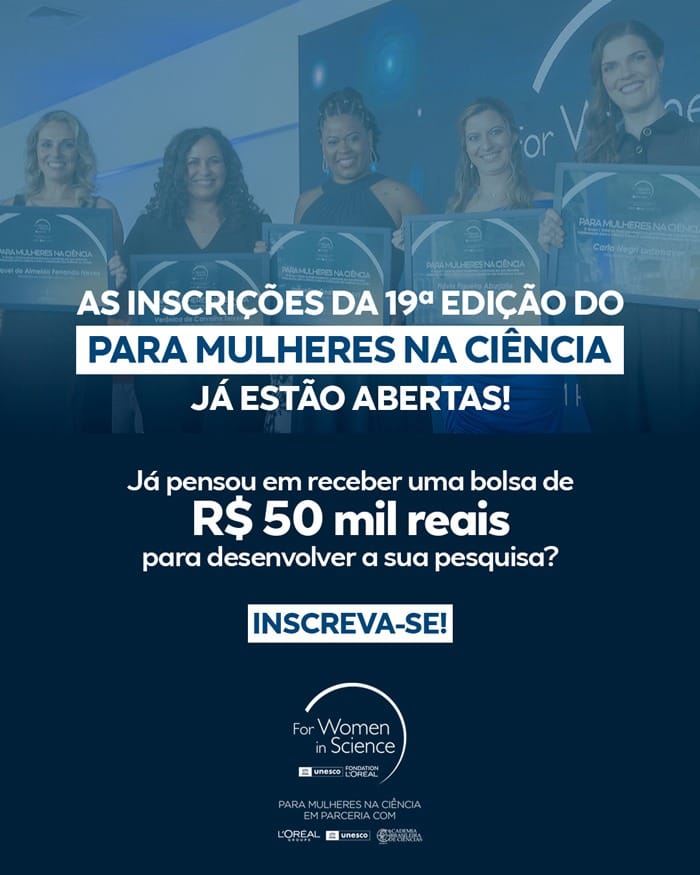 Estão abertas as inscrições para a 19° edição do Para Mulheres na Ciência no Brasil. Realizado pelo Grupo L’Oréal no Brasil, em parceria com a Academia Brasileira de Ciências (ABC) e a Unesco no Brasil, todos os anos o programa premia sete pesquisadoras com uma bolsa-auxílio de R$ 50 mil reais nas áreas de Ciências da Vida, Ciências Físicas, Ciências Químicas e Matemática. O objetivo é promover e reconhecer a participação da mulher na ciência, favorecendo o equilíbrio dos gêneros no cenário brasileiro. Interessadas devem se inscrever até 8 de maio.